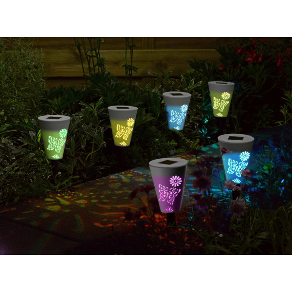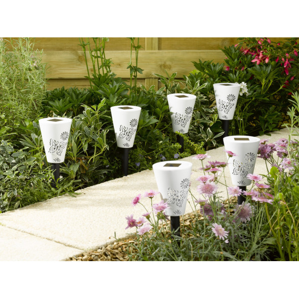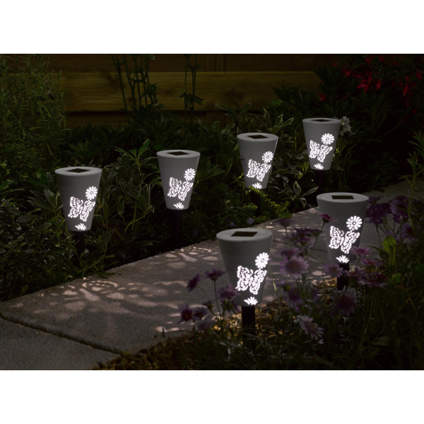 A la tombée de la nuit, elles s’illumineront en couleur ou en blanc selon votre choix et imprimeront de gracieux papillons sur vos allées